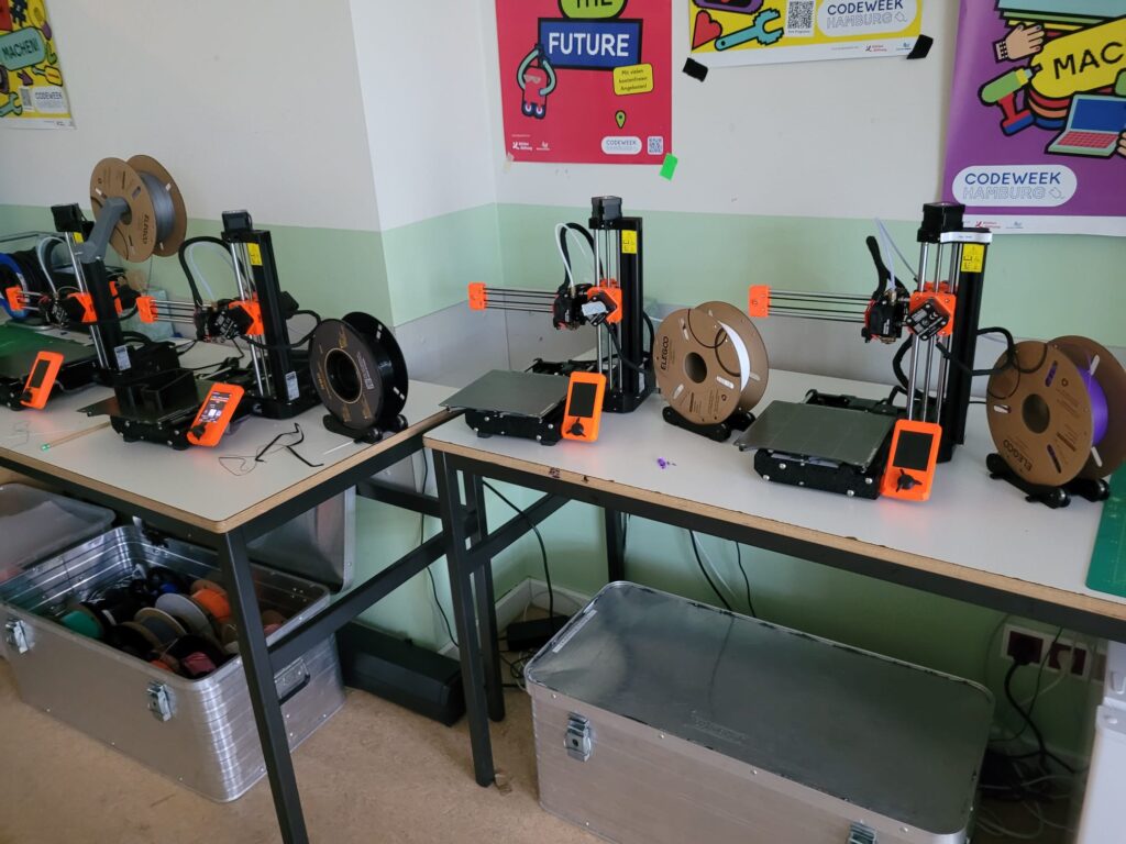 Mein Arbeitsplatz war alles andere als gewöhnlich: Statt langweiligen Aktenordnern standen 3D-Drucker, Lasercutter und Plotter um mich herum. Ich durfte Schüler*innen beim Bauen, Tüfteln und Programmieren begleiten, Workshops vorbereiten und selbst neue Dinge lernen. Besonders spannend war es, die Projekte der Club Mitglieder*innen zu begleiten und den Makerspace bei Events zu unterstützen. Aber auch eigene kleine Projekte blieben nicht auf der Strecke!